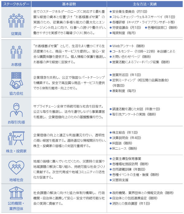 当社グループは、従業員、お客様、お取引先様、株主・投資家の皆様、地域社会など、多様なステークホルダーとの対話を重視し、信頼関係の構築に努めています。公正で透明性の高い経営を実践し、安心・安全な商品やサービスの提供、持続可能な社会の実現に向けた取り組みを推進します。ステークホルダーの皆様の声を経営に反映し、社会課題の解決と企業価値向上を目指します。
