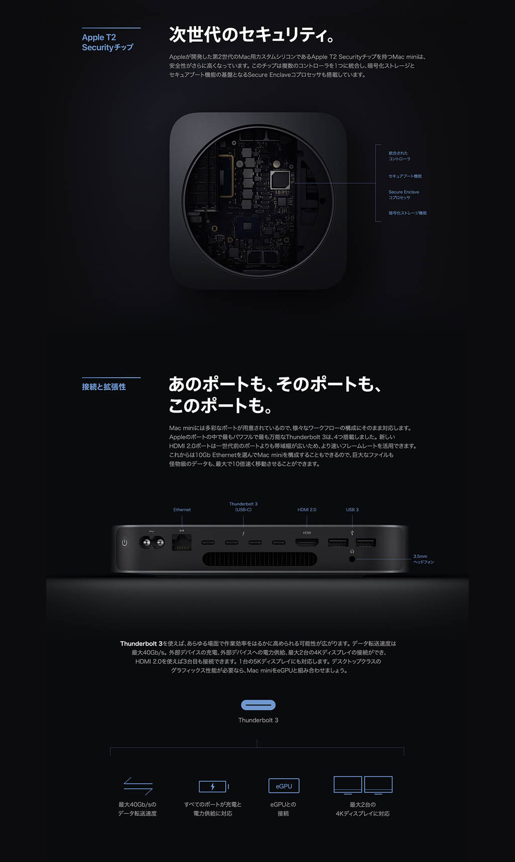 - 64GBのRAMと1TBのSSDを装備した3.2GHz 6コアIntel Core i7搭載Mac mini試作モデルと、16GBのRAMと1TBのSSDを装備した3.0GHzデュアルコアIntel Core i7搭載Mac mini量産モデルを使用し、2018年10月にAppleが実施したテスト結果によります。1,024KBのリクエストサイズ、150GBのテストファイル、IO depth=8を使用し、FIO 3.8でテストを実施。パフォーマンステストは特定のコンピュータシステムを使って実施したもので、Mac miniのおおよその性能を示しています。