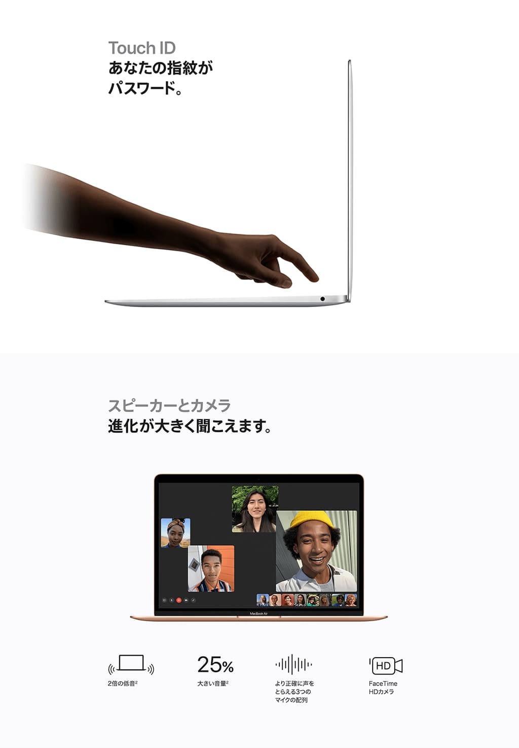 - Intel Iris Plus Graphics、16GBのRAM、2TBのSSDを装備した1.2GHzクアッドコアIntel Core i7搭載MacBook Air試作モデルと、Intel UHD Graphics 617、16GBのRAM、1TBのSSDを装備した1.6GHzデュアルコアIntel Core i5搭載MacBook Air量産モデルを使用し、2020年2月にAppleが実施したテスト結果によります。3Dタイトルのレンダリングの速度は、3,840x2,160解像度、毎秒30フレームのApple ProRes 422ビデオを含む10秒のプロジェクトを使用し、Final Cut Pro 10.4.8でテストを実施。パフォーマンステストは特定のコンピュータシステムを使って実施したもので、MacBook Airのおおよその性能を示しています。