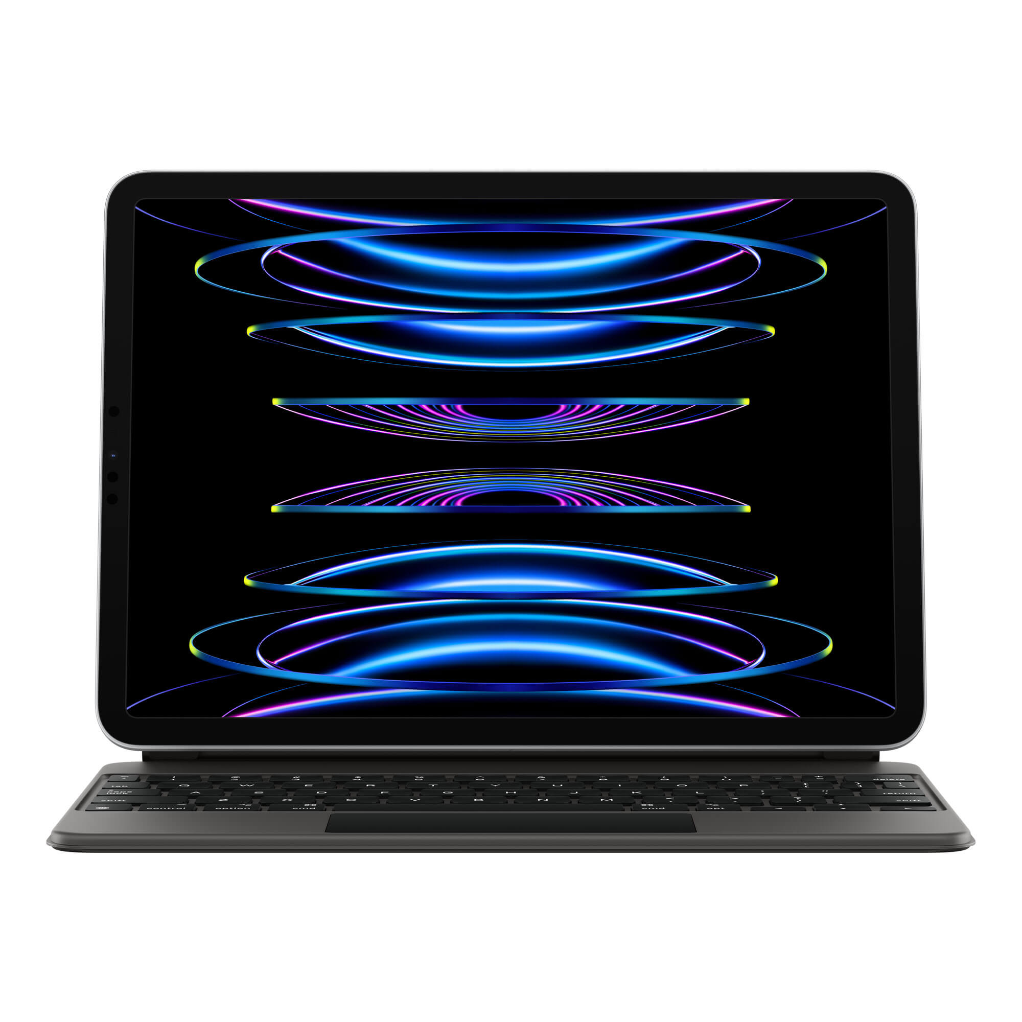iPad Pro用Magic Keyboardは、驚くほど快適なキーボードとトラックパッドを搭載。薄くてポータブルな新しいデザインで、アルミニウムのパームレストも用意されています。キーボードに追加された14のファンクションキー列から、スクリーンの明るさや音量を調節する機能などにすばやくアクセス。パススルー充電に対応したUSB‑Cコネクタや、画面を様々な角度にスムーズに調整できるフローティングカンチレバーも魅力です。