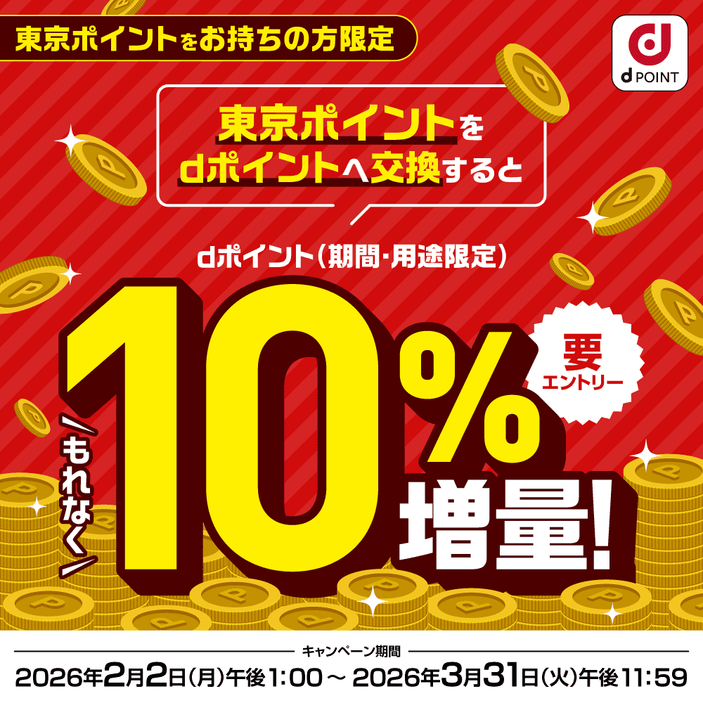キャンペーン期間中、東京ポイントから交換されたdポイントの合計の10%分を増量して進呈します。