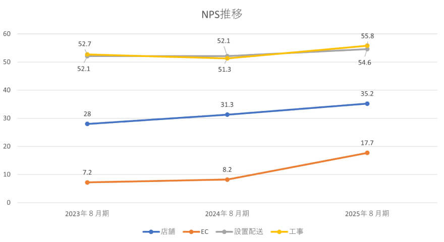 調査結果は、接客・売場づくり・サービス改善に活用し、顧客体験(CX)の向上につなげています。近年はNPSスコアが全体的に上昇しており、特にEC領域で顕著な改善が見られました。今後もお客様の声を大切に、商品・サービス品質の向上に取り組んでまいります。